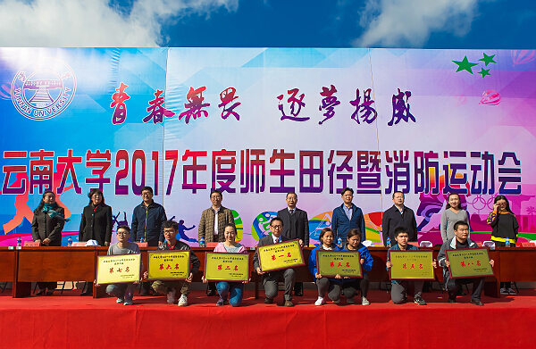 12日上午,在完成所有比赛项目后,云南大学2017年师生田径暨消防运动会举行了闭幕式,校党委常委、副校长丁中涛以及相关职能部门负责人出席闭幕式并为获奖团体颁奖。