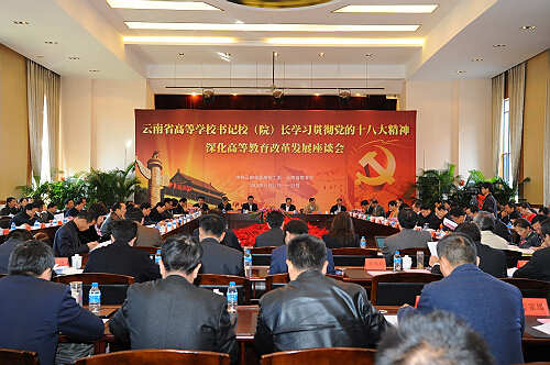 11月22日至23日,由省委高校工委、省教育厅举办的学习贯彻十八大精神、深化高等教育改革发展座谈会在昆举行。会议提出,以党的十八大精神为统领,为我省高等教育改革发展注入强大动力,凝心聚力推进区域性高水平大学建设。