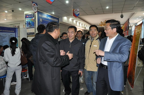 校党委副书记张昌山、副校长周学斌、学生处处长姬兴江、部分学院就业工作小组领导及老师来到招聘会现场,共同关注毕业生就业,并为毕业生就业服务。