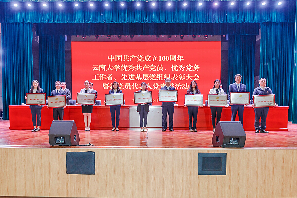6月25日,中国共产党成立100周年云南大学优秀共产党员、优秀党务工作者、先进基层党组织表彰大会暨新党员代表入党宣誓活动在呈贡校区学生会堂举行。新党员代表入党宣誓暨在场老党员重温入党誓词,颁发“光荣在党50年”纪念章,对优秀共产党员、优秀党务工作者、先进基层党组织予以表彰,共同回顾党的光辉历程,激励全体党员牢记为党育人、为国育才使命,以优异成绩庆祝建党百年华诞。