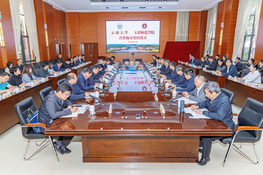 2023年4月7日,云南大学与玉溪师范学院签署合作协议,开启了云南大学与玉溪师范学院携手发展的新篇章。云南大学党委书记林文勋,党委副书记吴建德,副校长赵琦华,校党委常委、副校长刘波、陈克清,校长助理舒绍福,校党委常委、党委组织部部长郭磊,校党委常委、党委宣传部部长柳树,校党委常委、党委统战部部长高小秦,校党委常委、科技处处长段兴武,玉溪师范学院党委书记姜家雄,校长段红云,党委副书记杨光、张亚辉,副校长章新、李明、杨伟、李涛,以及双方相关职能部门和学院主要负责人参加签约仪式。吴建德主持签约仪式。