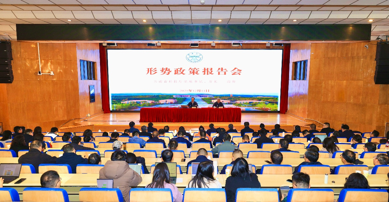 2025年12月11日,云南大学举行深入学习贯彻习近平总书记关于科技创新的重要论述形势政策报告会暨学习贯彻党的二十届四中全会精神干部培训大会。省科技厅党组书记、厅长高俊以“把握创新机遇 勇担时代使命——深入学习领会习近平总书记关于科技创新的重要论述”为题作报告。校党委书记周学斌主持会议。
