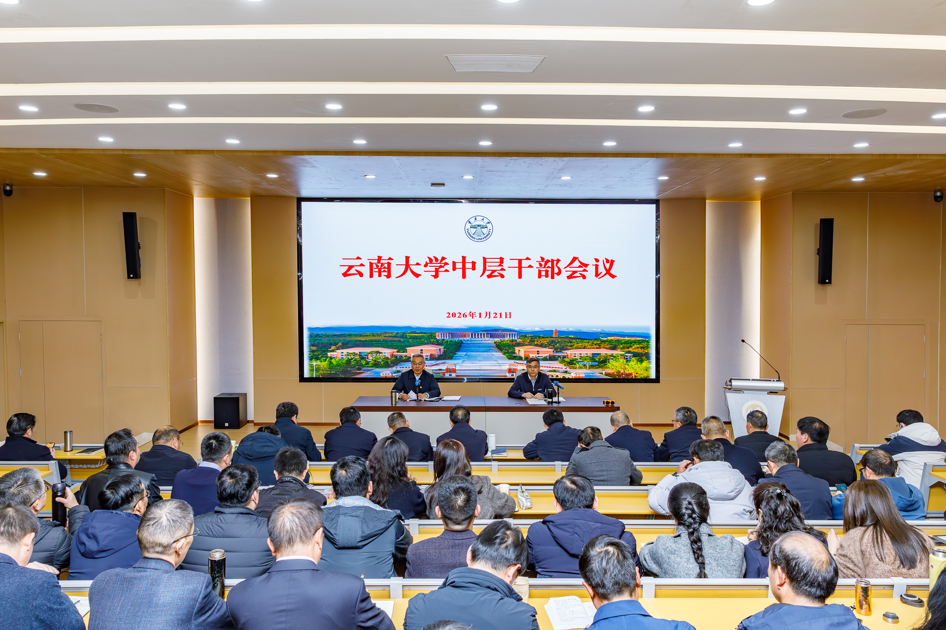 2026年1月21日,云南大学召开中层干部会议,总结2025年工作,安排2026年重点工作。校领导周学斌、马文会、张玮、吴建德、王爱平、陈克清、廖炼忠、吴涧、段兴武、杨绍军、唐年胜、彭云珠、丁恒道,教育部部省合建高校党建工作联络员张昌山,在职副处级以上干部参加会议。