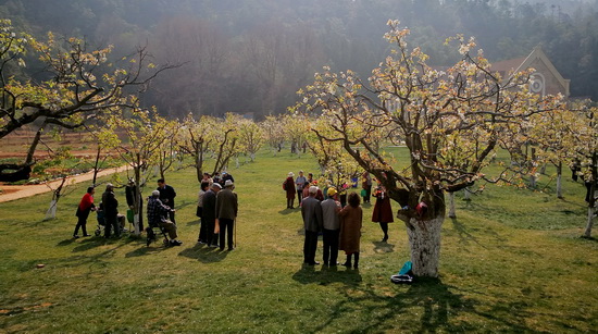 秋木箐庄园空气清新,林木蓊郁,古树、鲜花、草坪错落有致。最令人陶醉的,是园中的一片梨花海,微风吹过,片片花瓣纷飞散落,让人有远离尘嚣之感。老同志们置身其间,或成群结队漫步,观赏沿路风景,拍照留影;或三五好友兴致盎然下棋打牌,尽情享受退休生活的静好。老同志们见到久未谋面的老同事、老朋友,嘘寒问暖,亲切交谈。抚今追昔,感叹岁月的变迁、环境的改善;感叹学校的进步、国家的富强。从他们洋溢着笑容的脸上,不难看出他们内心的满足、喜悦和对国家日益强盛的自豪感。