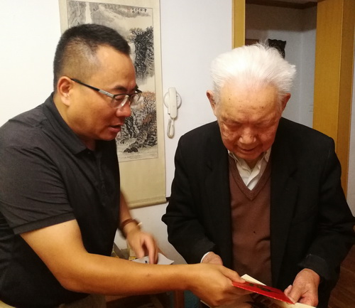 在夏老家中,学校离退休工作部门党委书记段勇首先代表学校恭贺夏老百岁寿辰,同时和夏老亲切交谈,详细了解老人的生活状况,同时叮嘱夏老的家人,要传递孝道文化的“正能量”,照顾好老人的生活起居,让老人在和谐和睦的家庭氛围中颐养天年。夏老的儿子夏雨生向大家介绍说,父亲是云南大学现在唯一健在的西南联大的毕业生,一辈子为学校、为工作兢兢业业,为党和国家培养了许多社会经济统计学专业人才,如今桃李满天下。他的学生们感念老师的培育之恩,每年都会自发相聚昆明,为他祝寿。