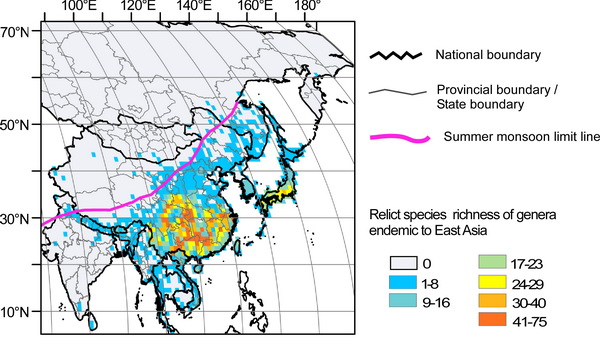 东亚有许多孑遗植物,尽管在古近纪-新近纪甚至更早地质年代这些孑遗植物大都在北半球有着广泛的分布,但是这些植物从第四纪以来已不存在于欧洲及北美(图一)。该研究从收集化石记录数据着手(共收集到有关植物在全世界3,192化石地理分布点),将133属的442个植物物种确认为当今东亚孑遗植物后,对这些植物在东亚15个国家(中国、日本、韩国、俄国东部、蒙古、尼泊尔、不丹、印度、斯里兰卡、蒙加拉国、缅甸、泰国、越南、老挝、柬埔寨)的当今分布进行了实地野外调查,且与在标本馆收集到的资料、数据相结合(共整合近80,000地理分布点),搞清楚了当今东亚孑遗植物的分布格局。东亚当今从越南中国地理交界处经中国亚热带/暖温带山地到日本暖温带山地有着很丰富的孑遗植物(图二)。然后建立生态-生态位模型进行分析研究,并更进一步结合唐勤教授及她的合作研究者20年以来所调查研究的422个亚洲孑遗森林的数据对东亚孑遗植物的幸存机制进行了全面深入的解析。