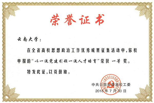 在思想政治工作优秀成果评选活动中,由党委组织部组织申报的《以一流党建引领一流人才培育》,党委本科生工作部·心理健康咨询中心组织申报的《云南大学心理育人的生态格局构建》,教务处组织申报的《构建—课堂—教材一体化育人模式,筑牢课堂意识形态阵地》,档案馆组织申报的《挖掘档案资源 传播校史文化——云南大学校史简明读本成果介绍》分别荣获一等奖。