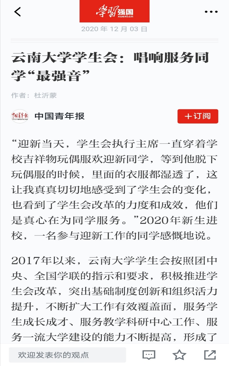 2020年12月3日,中国青年报、全国学联、学习强国刊载推介 “云南大学学生会:唱响服务同学‘最强音’”,充分肯定了云南大学学生会改革成效。近年来,云南大学学生会在校党委领导下,坚持以思想政治引领为根本,以全心全意服务同学为宗旨,严格按照团中央、全国学联关于学生会组织改革的相关要求,多措并举,扎实推进,成效显著。