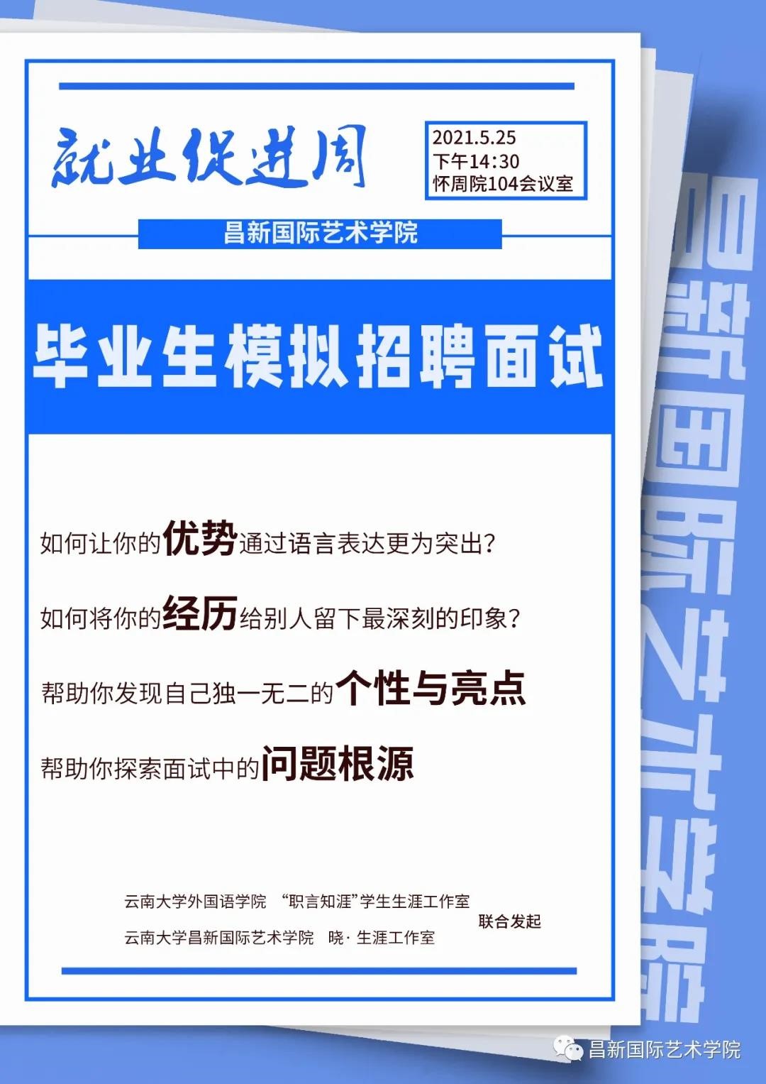 云南大学2021届毕业生就业促进周系列活动自5月17日启动以来,围绕“宣传、服务、指导”三个关键词,学校、学院、学生社团共同行动,开展了一系列具有实效性和影响力的就业指导和服务活动,在校园内掀起了人人关注就业、全员助力就业的热潮。