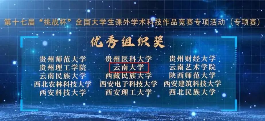 本届挑战杯,云南大学获特等奖1项(全国共49项),一等奖1项、二等奖1项、三等奖3项;在“黑科技”专项赛中,获“星系”级作品1项(最高奖,全国共48项)、“恒星”“行星”“卫星”级作品共3项。学校参赛成绩积分并列全国高校第11位,首次荣获特等奖,蝉联“优胜杯”,收获“优秀组织奖”“进步显著奖”(全国高校15个),创造了学校参与“挑战杯”赛事的历史最好成绩!