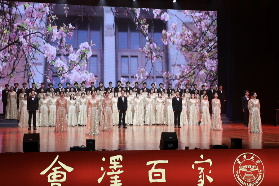 伴随着云南大学校歌在礼堂唱响,迎新晚会隆重拉开帷幕。云大校歌创作于1938年,由时任云南大学校长、中国现代数学先驱熊庆来先生作词,现代著名学者、音乐家赵元任先生谱曲,气魄宏大、催人奋进,激励新一届云大学子在博大无垠的知识海洋中探索求知、追求真理,为人民作贡献,让文明得发扬!