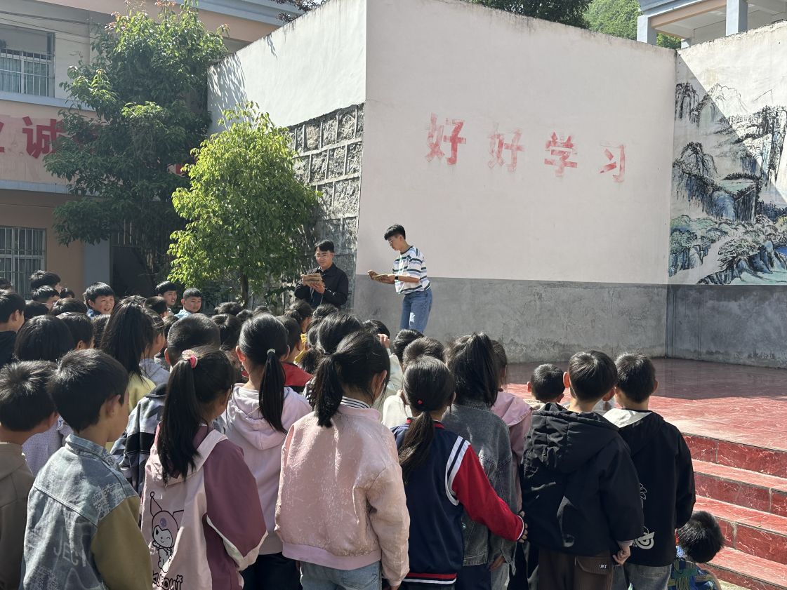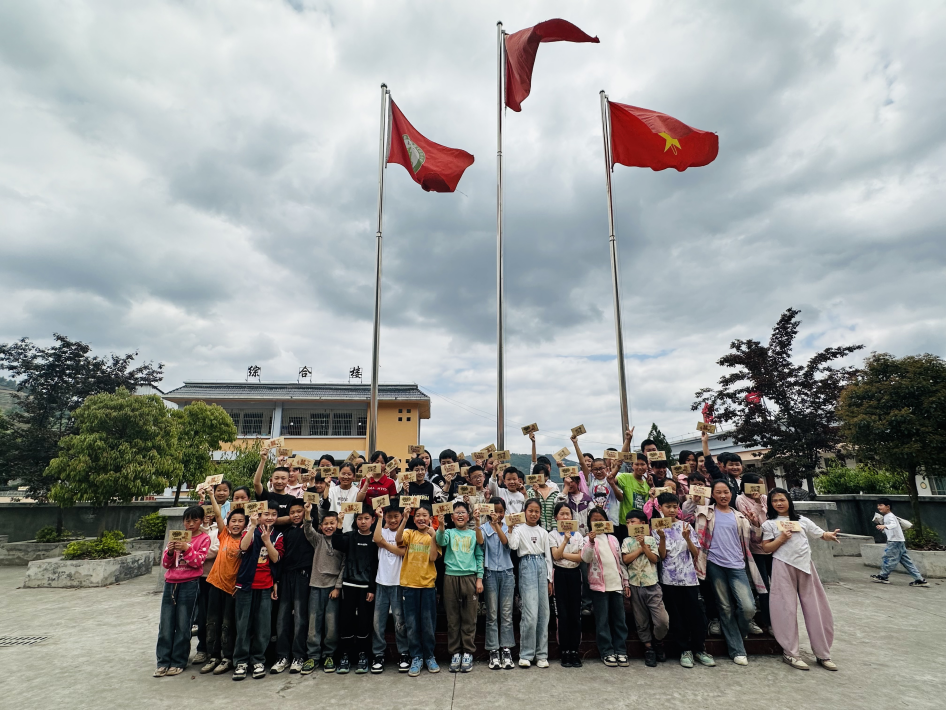 驻村工作队队员向孩子们展示了云大的银杏道、会泽院,讲述那些写信的大哥哥大姐姐的校园生活。当孩子们拿到带着墨香的回信和崭新的文具时,眼睛亮得像星星。有人兴奋地比画着,向小伙伴解释信中与志愿者哥哥姐姐约定的“友谊松”计划(一起种下象征友谊的小树苗);有人从口袋里掏出珍藏的“勇气徽章”——那是心灵手巧的志愿者用彩色易拉罐改造的小礼物;还有个小男孩,小心翼翼地摊开手心,掌心里躺着一粒饱满的向日葵种子,他信誓旦旦地对老师说:“我要把它种在教室窗台下!等它开花,写信告诉哥哥姐姐!”一位扎着马尾的小姑娘举着信站起来,大声念出信里的话:“姐姐说,蓝花楹开的时候,像紫色的瀑布。” 台下响起阵阵笑声,随后大家一起合影,照片里,孩子们的笑容与云大的风景照在展板上相映成趣。