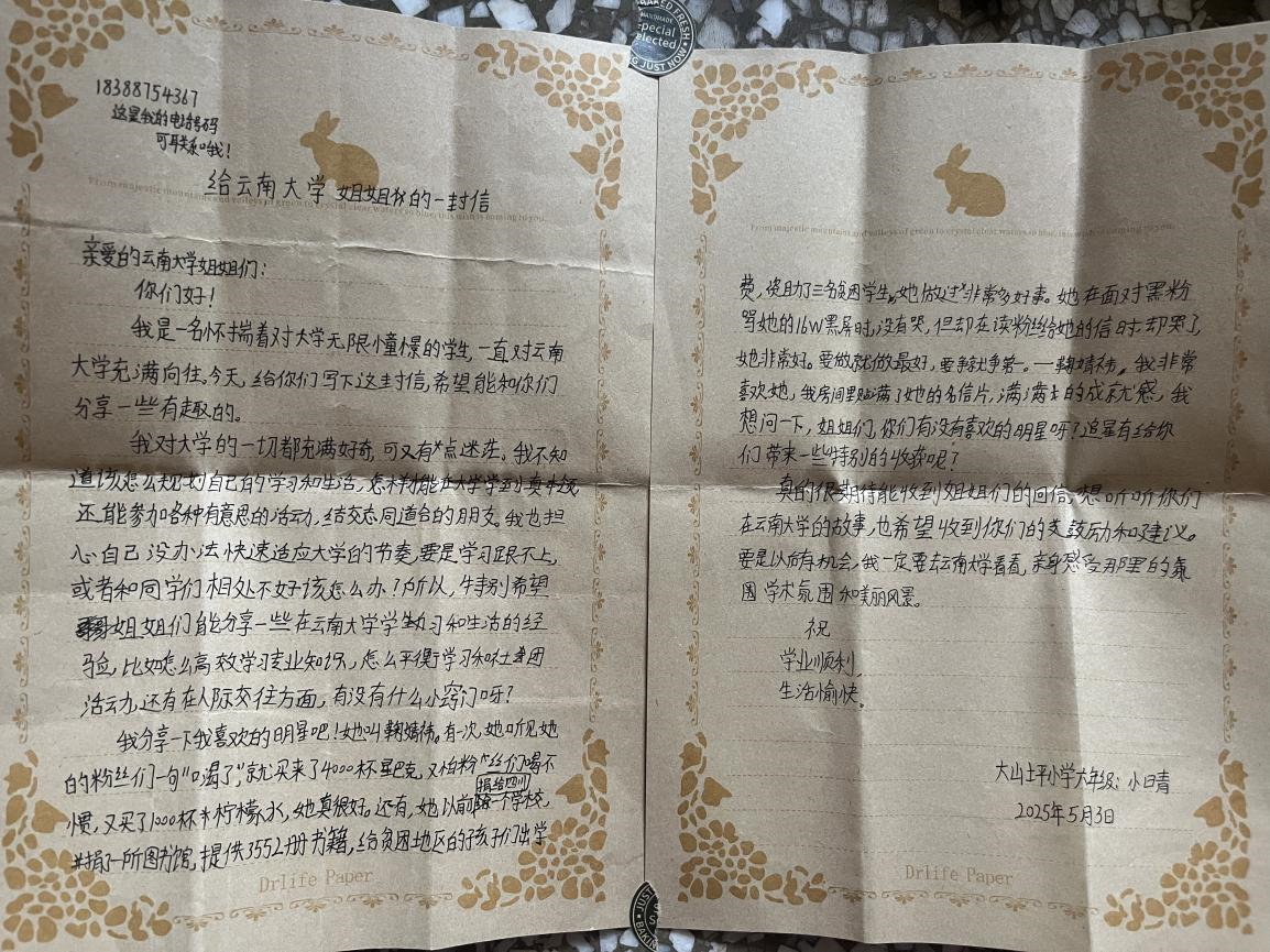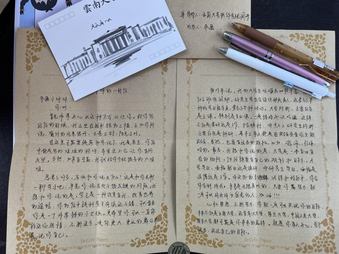 六年级的小晴,一笔一画写下对大学的憧憬,又小心翼翼地询问:“学习、生活上有什么小窍门吗?”信纸末端,她说偶像教会她“要做就做最好,要争就争第一”,床头贴满的明信片是她无声地宣誓。小晴信纸的最后一行写着“以后一定来云南大学看看”,每个字都写得很大,用力得几乎要戳破下面的横线格。