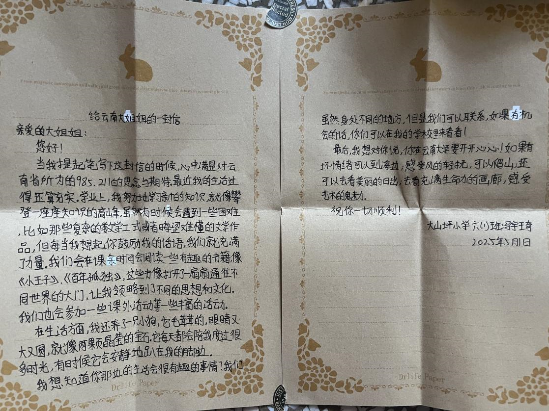 小美琳目前在读五年级,家中仅有奶奶照顾。她在给云南大学吴卓杰的信中倾诉了对数学的畏难情绪:“数学应用题像座错综复杂的迷宫,我总在里面兜兜转转,找不到出口。”她还好奇地打听:“你的学校啥样呀?是不是也有连绵的山,山上绿油油的树把校园给包裹起来啦?”