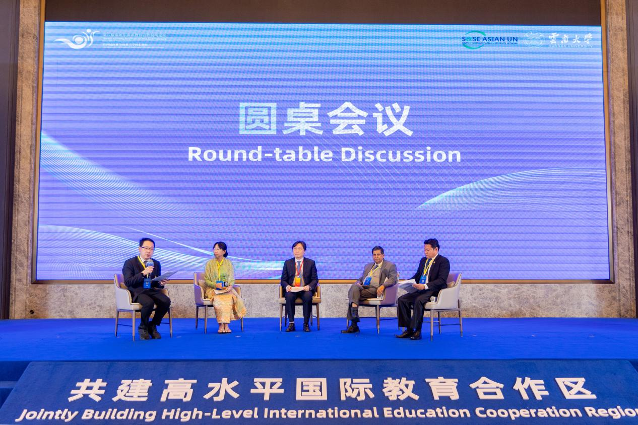 在圆桌会议环节,缅甸雅达那蓬大学校长丁莫杜萨、内蒙古大学副校长达胡白乙拉、孟加拉国国际商务农业与技术大学校长阿卜杜·拉布·米亚、老挝信息与通信技术研究院院长帕拉派·萨亚科特围绕“教育普惠的数字实践”主题作发言,泰国宋卡王子大学副校长塔康·翁西里初主持。