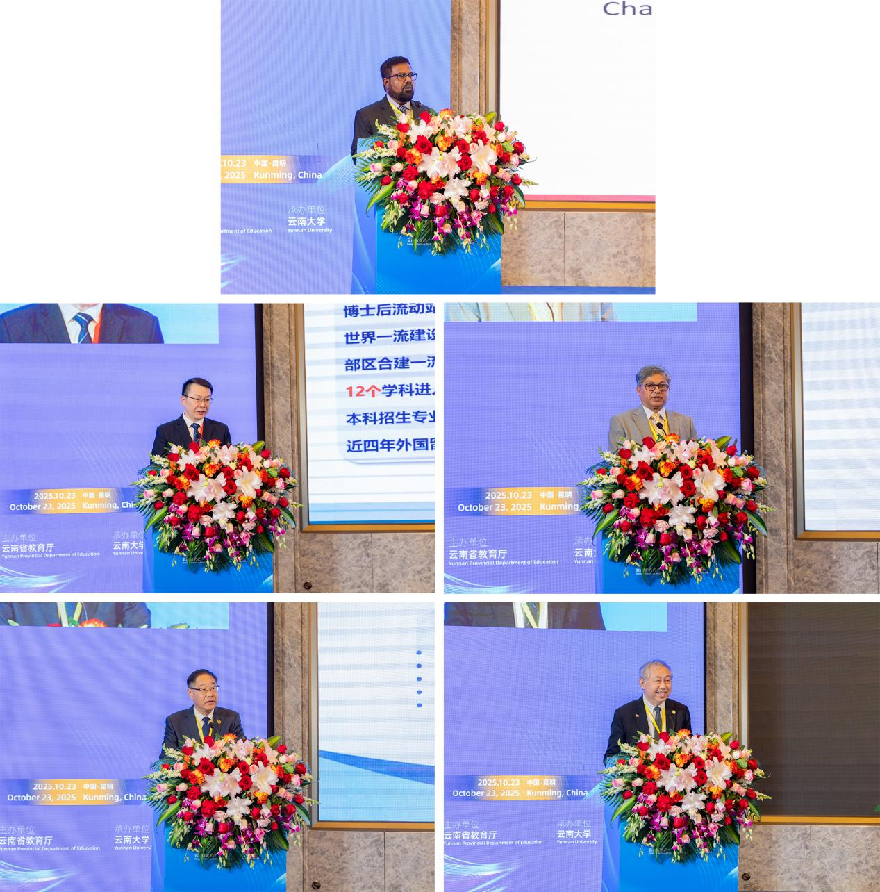 马尔代夫国立大学校长马哈姆·舒吉、广西大学副校长赵双良、孟加拉国南北大学校长阿卜杜尔·汉南·乔杜里、昆明理工大学副校长蒋业华、菲律宾德拉萨大学副校长周纯峰围绕“数智技术驱动下的高等教育转型路径”作主旨发言。