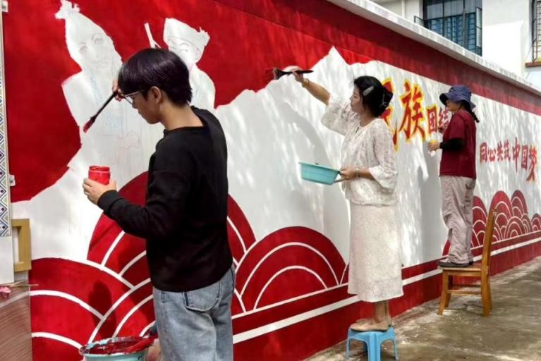 在教学之余,支教师生还积极参与景洪市、鲁甸县受援中小学的校园文化建设,将民族团结进步宣传教育融入墙绘,繁荣校园文化,以景润心,以美化人,努力为乡村孩子校园生活增色添彩,促进学生身心健康发展。