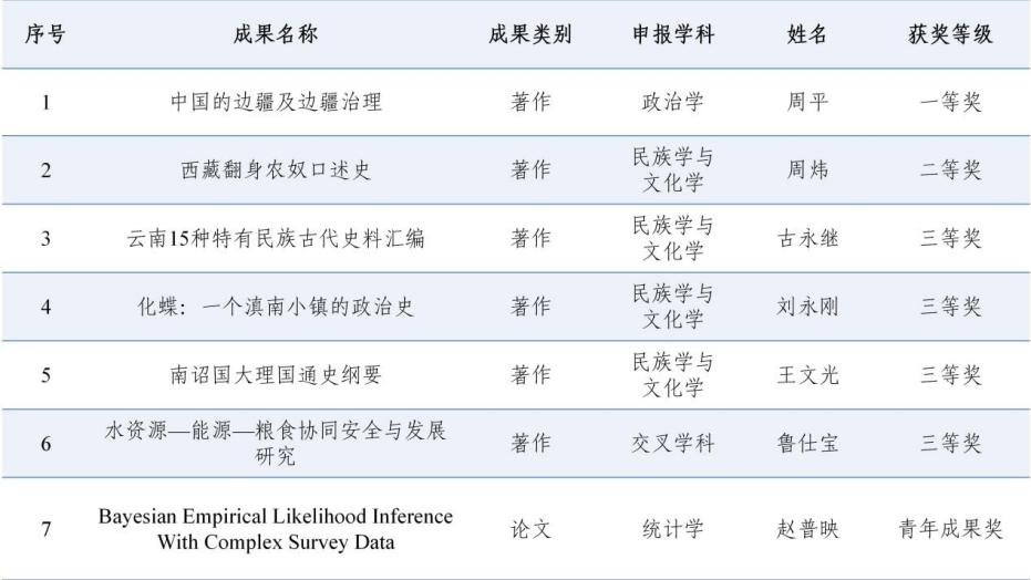 云南大学获第九届教育部高等学校科学研究(人文社科)优秀成果奖一览表