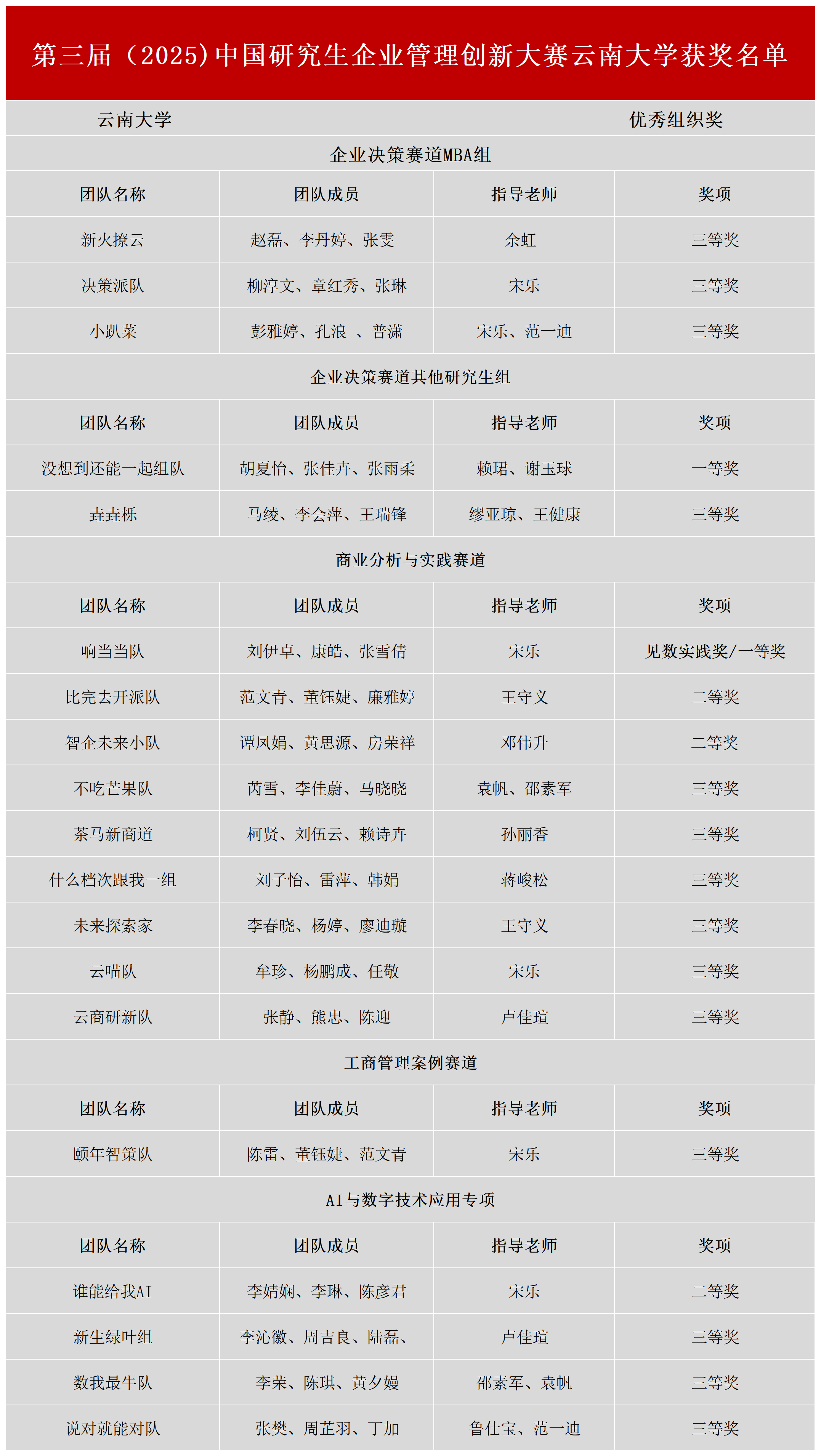 11月7日-11月9日,第三届(2025)中国研究生企业管理创新大赛全国总决赛在贵阳举行。云南大学研究生学子在本届比赛企业决策赛道、商业分析与实践赛道、工商管理案例赛道、AI与数字技术应用专项中斩获一等奖2项、二等奖3项、三等奖14项、学校获得优秀组织单位。