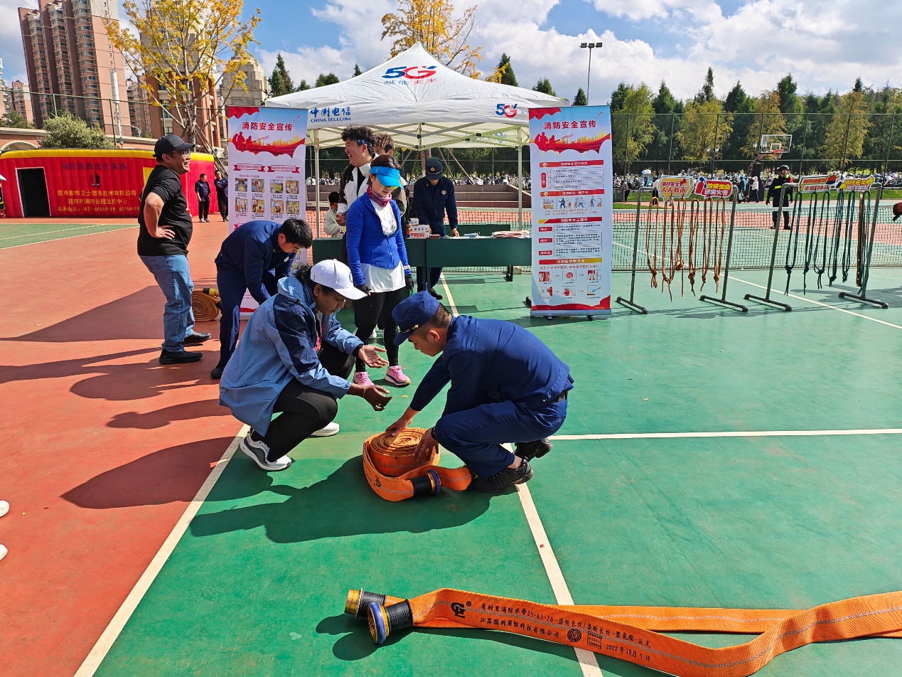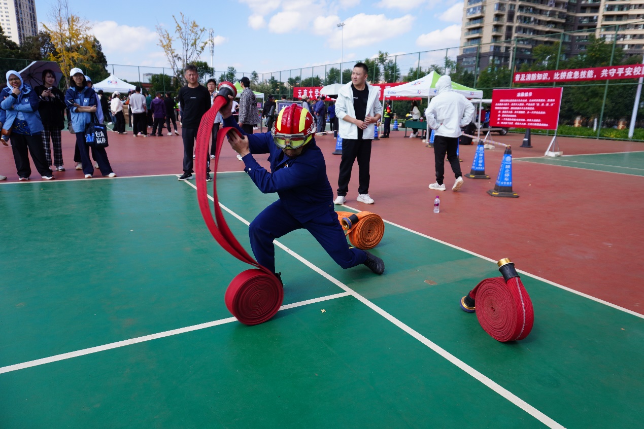 活动现场,学校联合呈贡消防救援大队打造了“沉浸式消防安全体验区”,推出多项创新展示内容。除了水带保龄球、翻轮胎、绳结练习等传统项目,新增的模拟烟雾逃生帐篷、消防器材实操体验让参与者直呼“有收获!”。消防救援人员现场还示范各类灭火器、消防水带的正确使用方法,通过“手把手”教学帮助师生突破理论认知壁垒,现场图文展板将案例讲解与互动问答相结合,将火灾逃生技巧、日常防火注意事项等知识转化为通俗易懂的实操指南,帮助师生准确掌握应急避险关键技能。