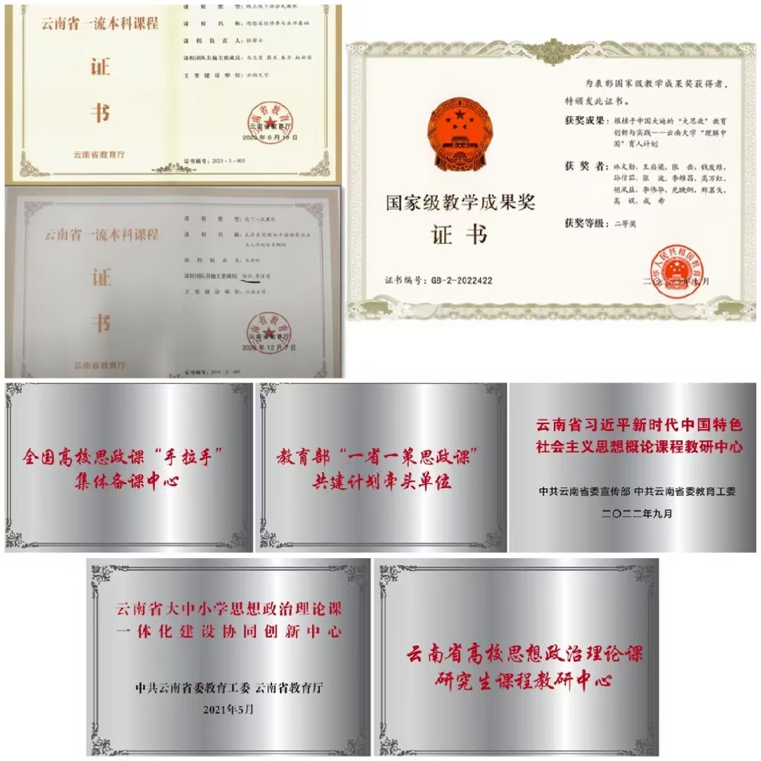 学院进一步完善以习近平新时代中国特色社会主义思想为核心内容的课程群建设,开展“师生共建思政金课”试点工作。三年来,依托“全国高校手拉手集体备课中心(云南大学-云南省)”“云南省习近平新时代中国特色社会主义思想概论课程教研中心”等国家级、省级思政课建设平台,举办“云上大练兵”等集体备课50余次;与云南省档案馆、畹町出入境边防检查站、普洱市宁洱哈尼族彝族自治县民族团结园、迪庆州民委、丽江市委宣传部、文山干部学院、云南出入境边防检查总站轮训大队等单位携手共建“思政课实践教学基地”38个,组织师生先后赴普洱开展《中华民族共同体概论》现场教学,赴迪庆、丽江、磨憨、腾冲等地开展“我们的边疆”等思政课实践教学活动50余场,并与结对单位开展思政课实践教学“手绘地图”活动;作为唯一的学术指导单位,学院与共青团云南省委联合打造了云南省“挺膺担当”青春思政课品牌,该品牌在全国青年大思政工作领域产生了广泛影响;面向全省高校马克思主义学院及部分中小学,组织召开了“全面贯彻落实习近平总书记云南重要讲话精神·深入推进学校思政课建设高质量发展工作研讨会”;创办省内首档大学生思政融媒体栏目“你好,大学生!”,累计总参与互动流量超2000万人次。学院荣获国家级教学成果奖3项,教育部思政课平台建设项目2项,省级虚拟仿真实验教学一流本科课程1项,省级教改项目24项,省级一流课程2门,以及50余项省级国家级教学比赛奖项,彰显了学院在创新培养模式、凸显专业特色、加强内涵建设、提高教育质量等方面取得的成绩。