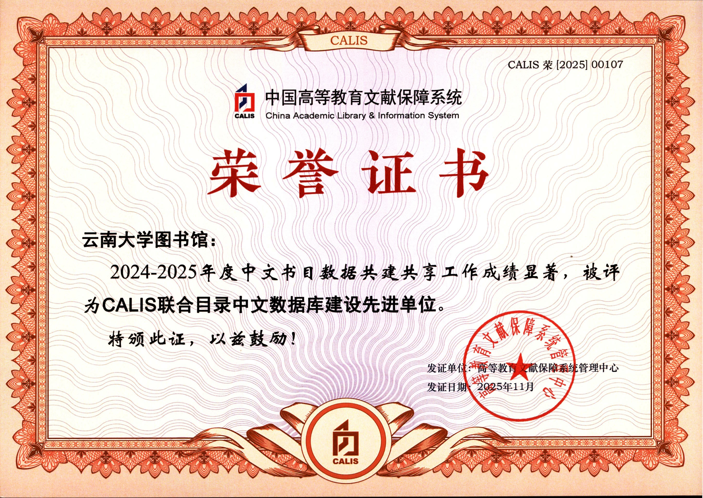 近日,中国高等教育文献保障系统(CALIS)联机合作编目中心发布2025年度联合目录数据库建设排行榜。云南大学图书馆凭借在中文和多语种书目数据库建设中的突出表现,多项核心指标持续位居全国2000余所高校成员馆前列,被评为“CALIS联合目录中文数据库建设先进单位”,再次彰显了云大图书馆在全国高校文献资源建设与知识组织领域的领先地位。