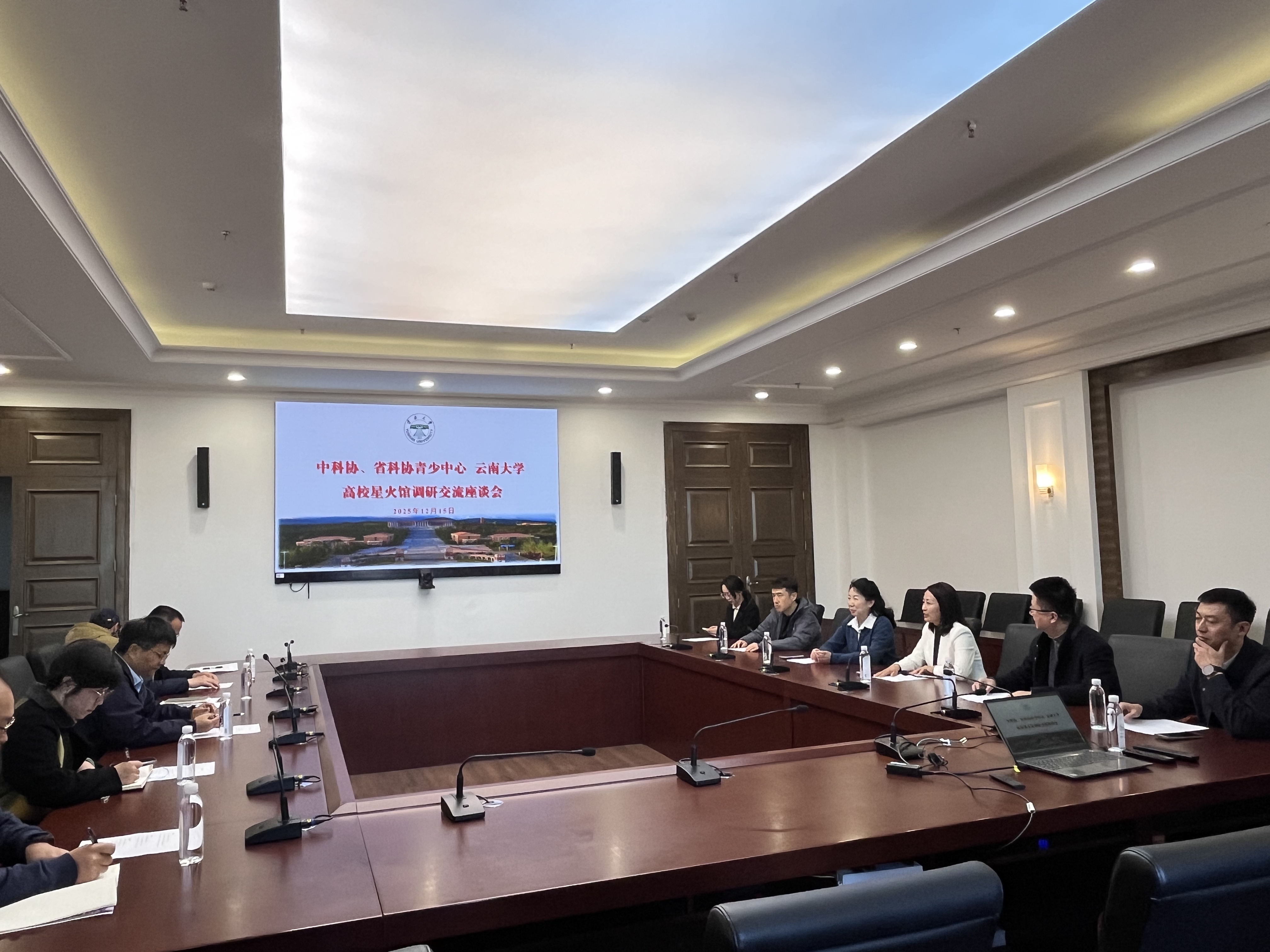 12月15日,中国科协青少年科技中心主任辛兵一行到访云南大学,调研学校科协和高校星火馆项目建设等工作。省科协副主席袁晓瑭,省青少年科技中心主任何韬,云南大学副校长段兴武,以及学校科技处(校科协)、物理与天文学院、古生物研究院负责人等参加调研座谈会。