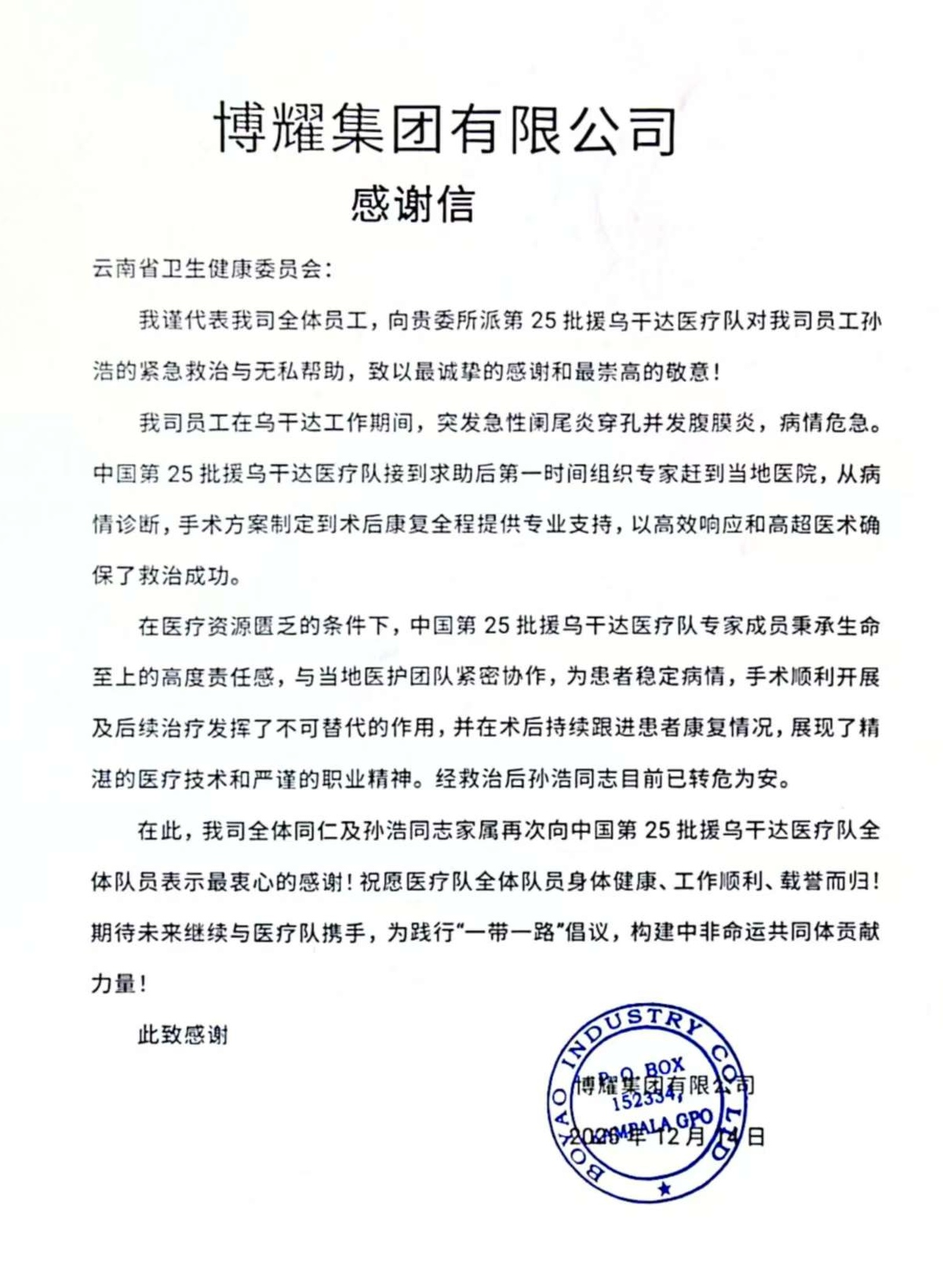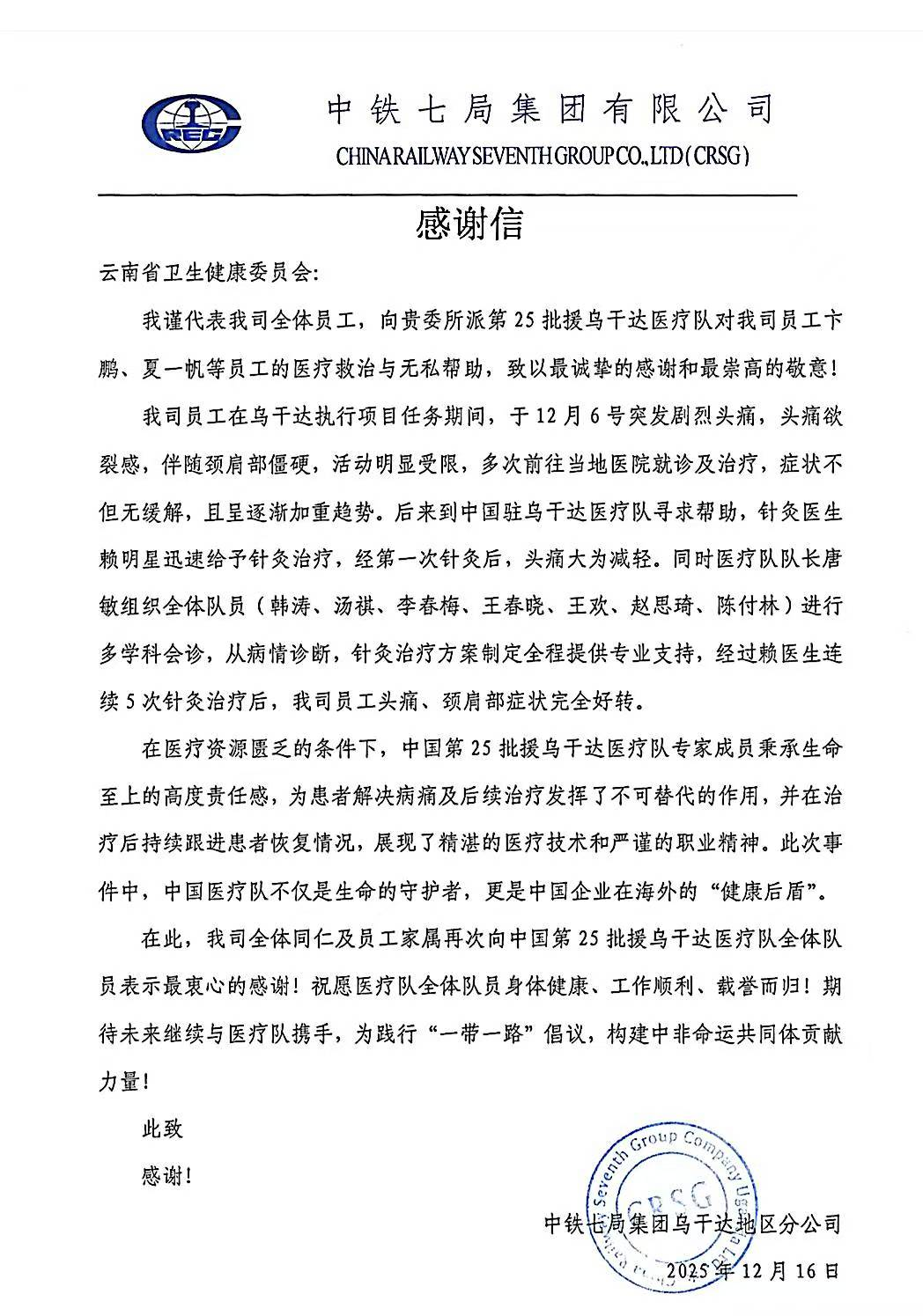 相关诊疗救治工作结束后,中铁七局集团有限公司、博耀集团有限公司分别致信云南省卫生健康委员会,对援乌医疗队给予的医疗支持表示感谢。来信中表示,医疗队在当地为中资企业员工提供了及时、专业的医疗帮助,切实解决了实际困难。