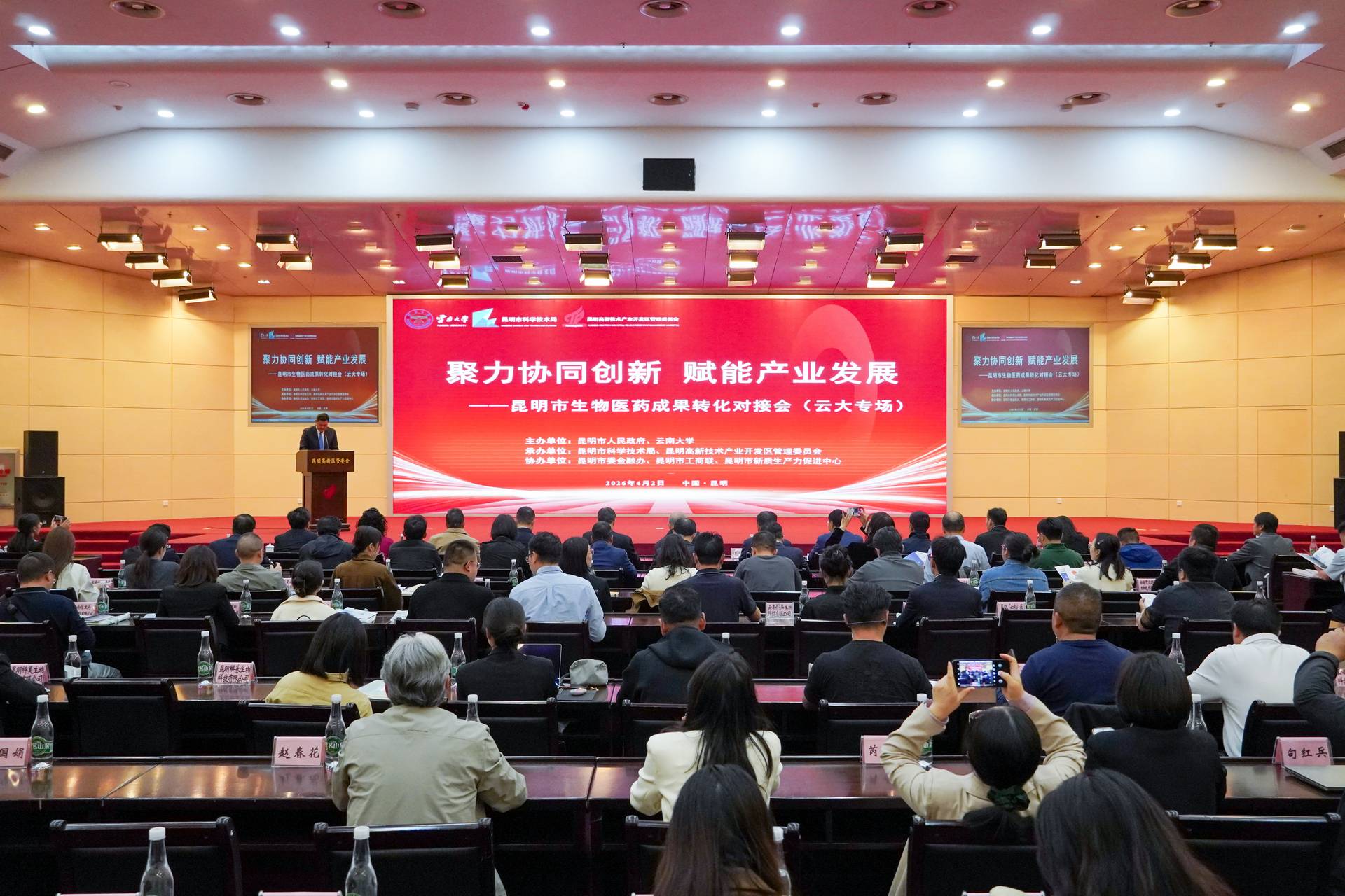 2026年4月2日,昆明市生物医药成果转化对接会云南大学专场举行。会议主题为“聚力协同创新、赋能产业发展”,由昆明市人民政府、云南大学主办,昆明市科技局、昆明市高新区管委会承办。