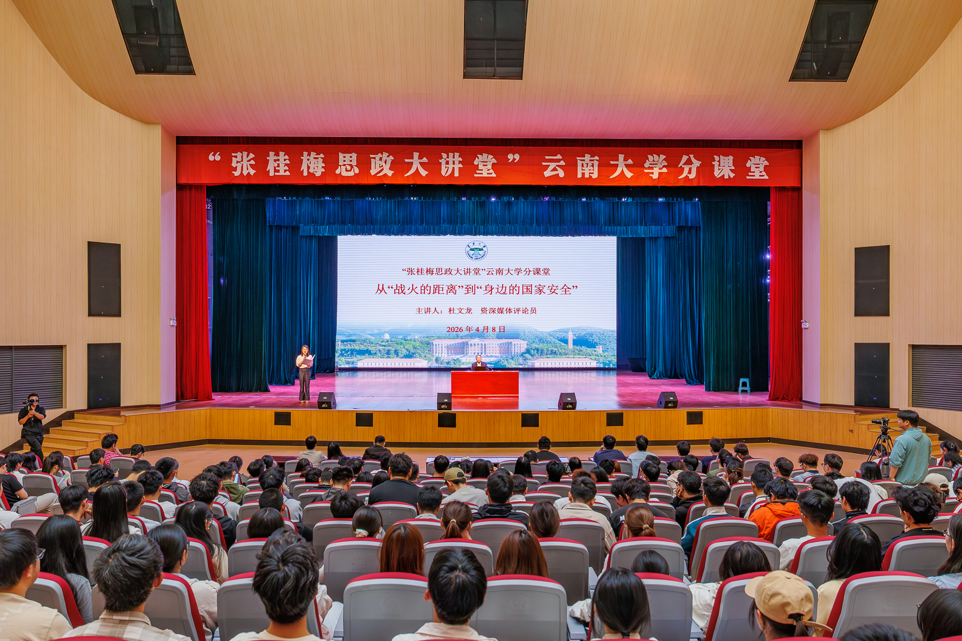 2026年4月8日,“张桂梅思政大讲堂”云南大学分课堂2026年度第一讲举行,邀请军事专家、资深媒体评论员杜文龙教授,以《“从战火的距离”到“身边的国家安全”》为题,面向在昆高校师生代表授课。