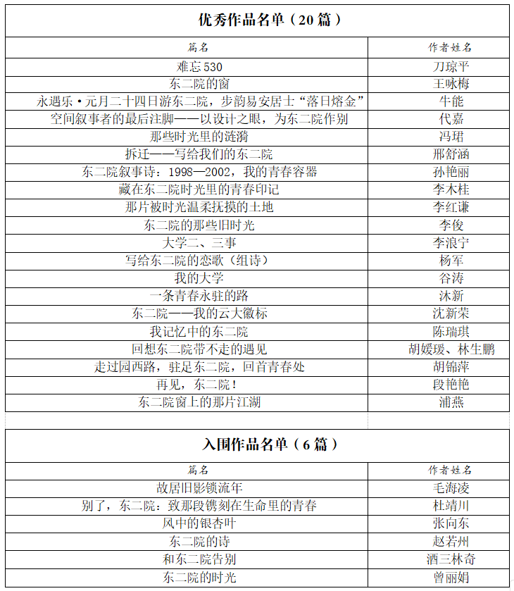 “云南大学东二院记忆”征文优秀作品、入围作品评选工作现已结束。征文经专家组评审,综合评选出优秀作品、入围作品共26篇(排名不分先后,按姓氏笔画排序),特此公告。名单如下: