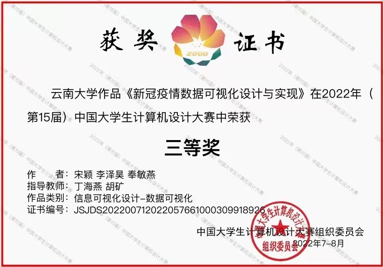 《新冠疫情数据可视化设计与实现》三等奖奖状