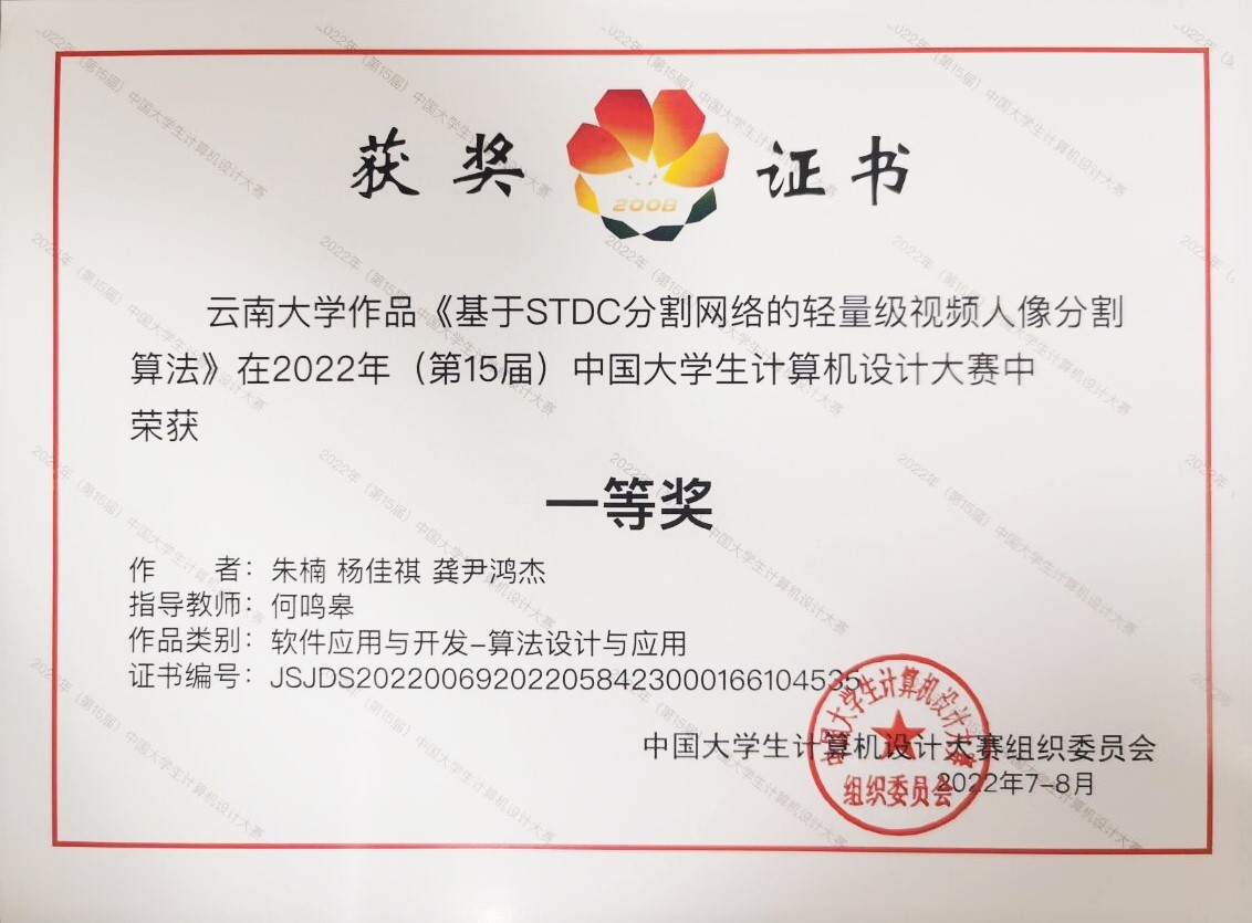 《基于STDC分割网络的轻量级视频人像分割算法》一等奖奖状