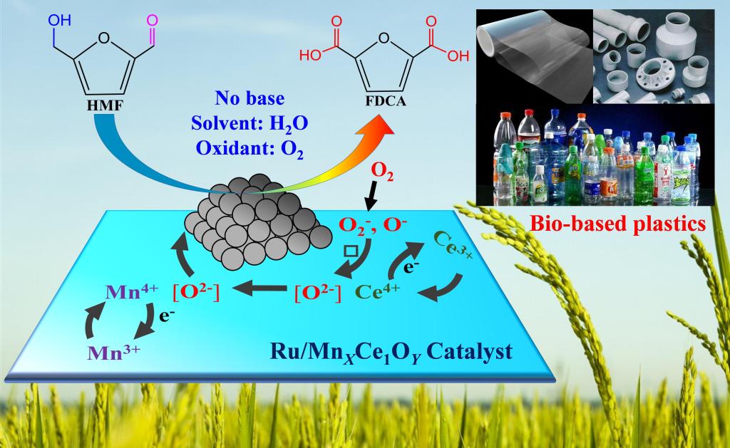 生物质是地球上储量最为丰富的可再生资源之一,催化转化自然界广泛存在的木质纤维素资源制高附加值燃料和化学品,在一定程度上逐步缓解人类对不可再生化石燃料的依赖,已经快速成为化学学科一个非常重要的发展共识和基础研究方向。生物质平台化合物5-羟甲基糠醛(HMF)选择氧化制生物质高分子单体2,5-呋喃二甲酸(FDCA),以替代石油炼制衍生物对苯二甲酸,用以生产可再生PET工程塑料,广泛用于薄膜,管道,包装软饮料的塑料瓶等。美国可口可乐公司(Coca Cola,全球最大的饮料公司),法国达能集团(Danone,世界著名的食品集团)和奥地利阿普拉集团(ALPLA,世界吹塑包装巨头)已在发达国家市场上实现了30%以上的可循环利用生物质PET塑料瓶使用率。