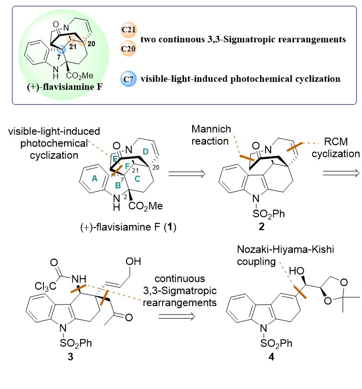 夹竹桃科蕊木属植物以复杂吲哚生物碱为特征性化学成分,同时这类生物碱具有重要的生理活性,是天然产物化学家和药理学家的关注焦点。文章报道的蕊木属生物碱(+)-flavisiamine F环系复杂、结构刚性,由5个连续的稠环和1个桥环组成,同时分子包含5个连续的手性中心,其中C20和C7位的2个全碳季碳手性中心使得目标分子的不对称全合成具有非常高的挑战性。