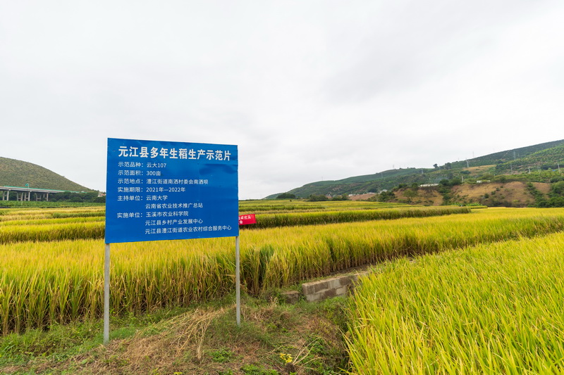 金秋时节,云南省元江县南洒村梯田种植的300亩多年生稻“云大107”一片金黄。10月24日,农业农村部水稻专家组对云南大学、云南省农业技术推广总站、玉溪市农业科学院及元江县产业发展中心等单位组织实施的多年生稻“云大107”示范区进行了田间测产。测产结果显示:百亩连片晚稻平均亩产464.8千克,加上7月份第一季早稻测产的平均亩产655.65千克,一年“一种两收”稻谷平均亩产1120.45千克。这是迄今为止多年生稻“云大107”在云南大面积推广种植的最高产量。