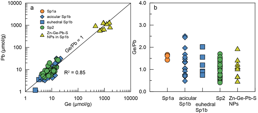 图3闪锌矿与富锗纳米颗粒Ge和Pb含量关系