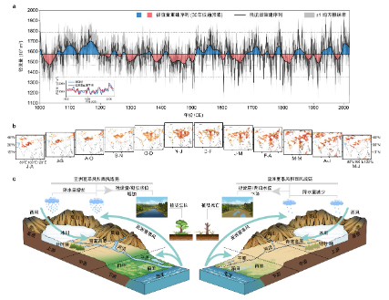 陈峰研究员联合国内外团队,基于青藏高原南部树木年轮宽度数据,重建了过去千年来雅鲁藏布江、湄公河和萨尔温江的总径流量变化,并结合相关模式预测了未来径流量的变化趋势。结果表明:(1)青藏高原径流量与流域下游旱季植被生产力显著正相关,指示了青藏高原径流量对东南亚生态和社会系统功能的重要性;(2)青藏高原径流量在流域文明演化进程中扮演了重要角色,中世纪暖期丰沛的河流水资源促进了蒲甘王朝崛起和吴哥窟修建,小冰期水资源较少与缅甸衰弱和吴哥窟废弃相对应,这为东南亚文明演化研究提供了新的视角;(3)研究还发现,北大西洋多年代际变率和太平洋十年涛动是引起过去千年径流量变化的重要气候系统内部变率,考虑驱动因素影响的预测模型结果显示,未来青藏高原流入东南亚和南亚的径流量可能达到甚至超过中世纪暖期丰沛水资源的水平。