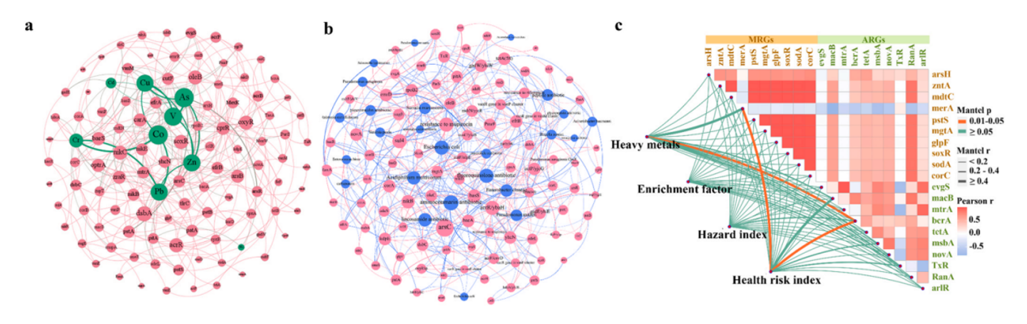图1 (a)生物膜中重金属与MRGs和ARGs的网络分析;(b)微生物与MRGs和ARGs的网络分析图;(c)对重金属的可降解物质和可降解物质以及生态健康风险进行曼特尔分析