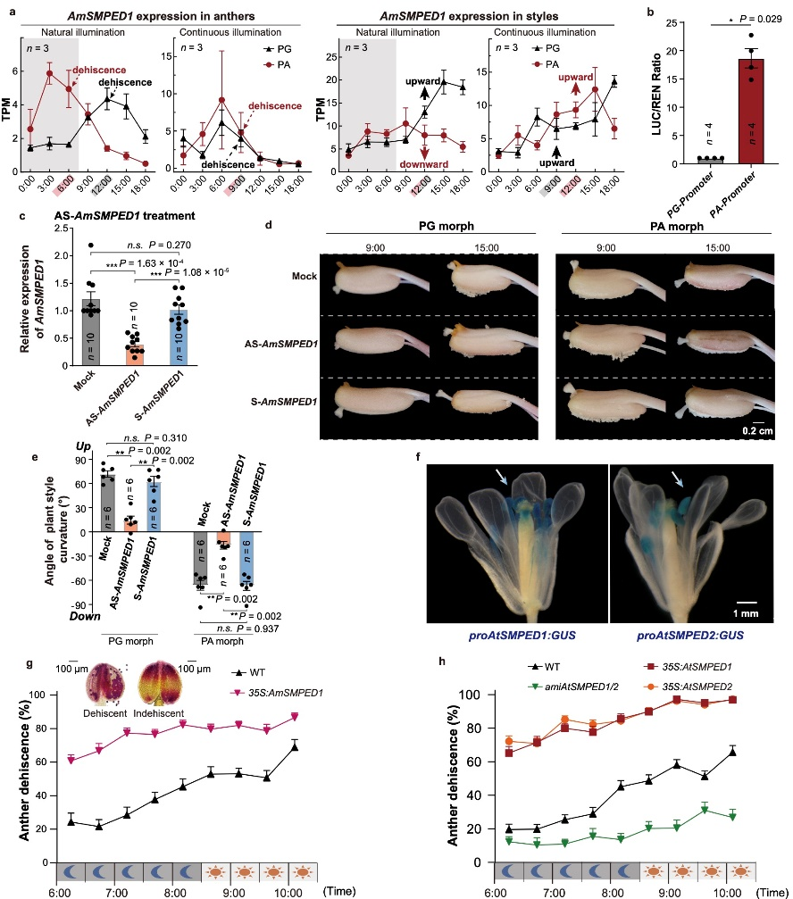 图3. 验证SMPED1是一个多效性基因。 a. 在自然光照与连续光照下AmSMPED1的基因表达与花柱运动和花粉囊开裂的时序相对应; b. 两种花型启动子活性存在差异; cde. 反义寡核苷酸下调AmSMPED1的表达并抑制花柱运动; fgh. AmSMPED1基因在拟南芥中有两个同源基因特异性的在花粉囊中表达,并且它们都正向调控花粉囊开裂。