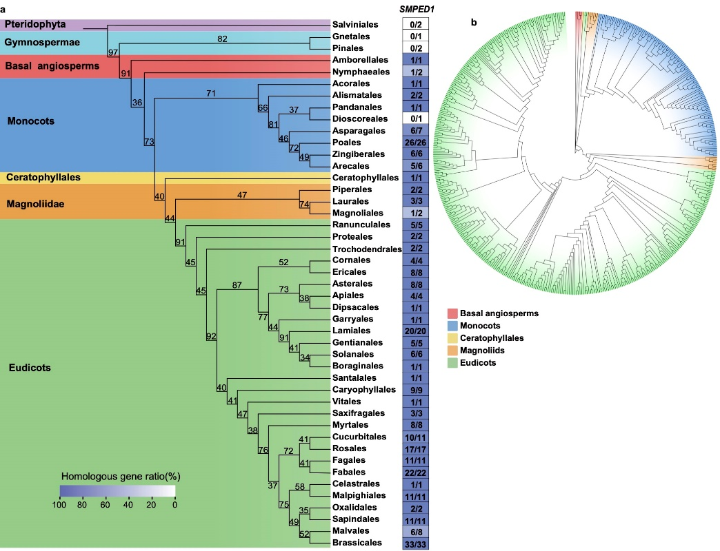 图5. SMPED1的植物谱系演化。 a. SMPED1在被子植物中的分布; b. 解析SMPED1基因树。