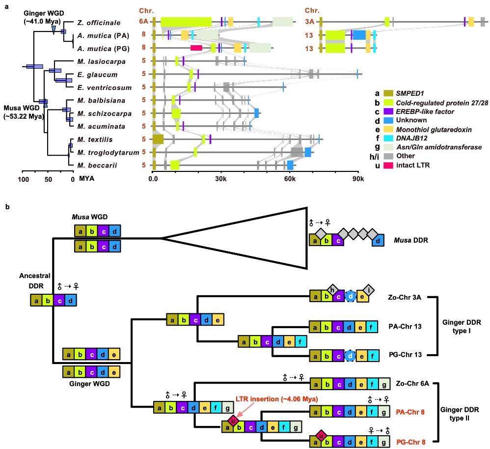 图4. DDR的起源。 a. 构建芭蕉科与姜科的系统发育树,并对各物种的DDR进行比对,展示分化时间、全基因组加倍事件及共线同源关系; b. 依据基因获得与丢失事件重建祖先DDR,揭示其组成及演化轨迹。