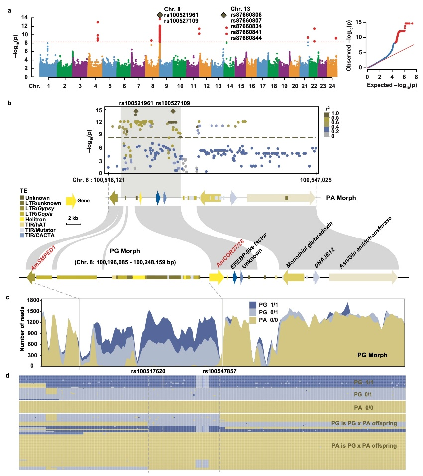 图2. 马来良姜基因组中鉴定“雌雄异熟决定区域”(DDR)。 a. 通过GWAS定位到雌雄异熟关键区域; b. 8号染色体末端连锁不平衡分析; c. 基于不同基因型的测序覆盖度曲线; d. 对实验群体的标记进行人工筛查。