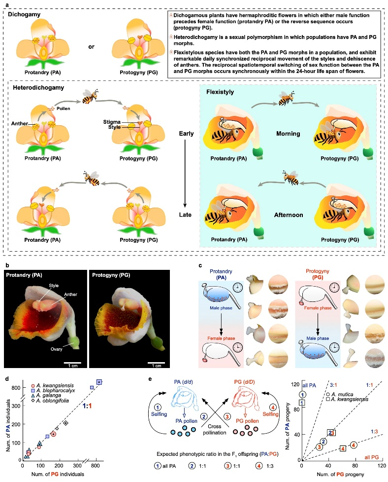 图1. 山姜属中雌雄异熟性状呈现孟德尔式遗传。a.雌雄异熟、异型雌雄异熟和花柱卷曲性关系;b. 马来良姜雌先熟和雄先熟的两种花型;c. 马来良姜两种花型开花当天互补的发育进程; d. 两种花型野外保持1:1比例共存;e. 两型杂交F1代符合孟德尔单基因显性模型。