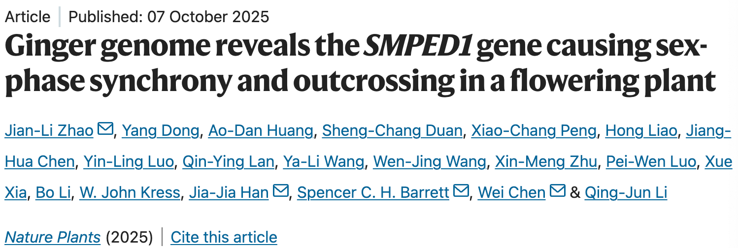 2025年10月7日,Nature Plants在线发表了云南大学、云南农业大学、中国科学院西双版纳热带植物园、加拿大多伦多大学、美国史密斯研究所国家自然历史博物馆、普洱学院多家单位共同完成的题为“Ginger genome reveals the SMPED1 gene causing sex-phase synchrony and outcrossing in a flowering plant”的研究论文(https://www.nature.com/articles/s41477-025-02125-3或https://rdcu.be/eJNGq)。该研究在已故著名植物进化生态学家李庆军教授二十余年系统研究“花柱卷曲性”(flexistyly)的基础上,以姜科(Zingiberaceae)山姜属(Alpinia)植物为研究材料,经历近十年的攻关,确定了花柱卷曲性的遗传规律,鉴定出关键新基因AmSMPED1,并揭示其顺式调控与演化背景,阐明了花柱卷曲性的分子调控机理,为理解被子植物雌雄异熟的起源与维持机制提供了新的见解。