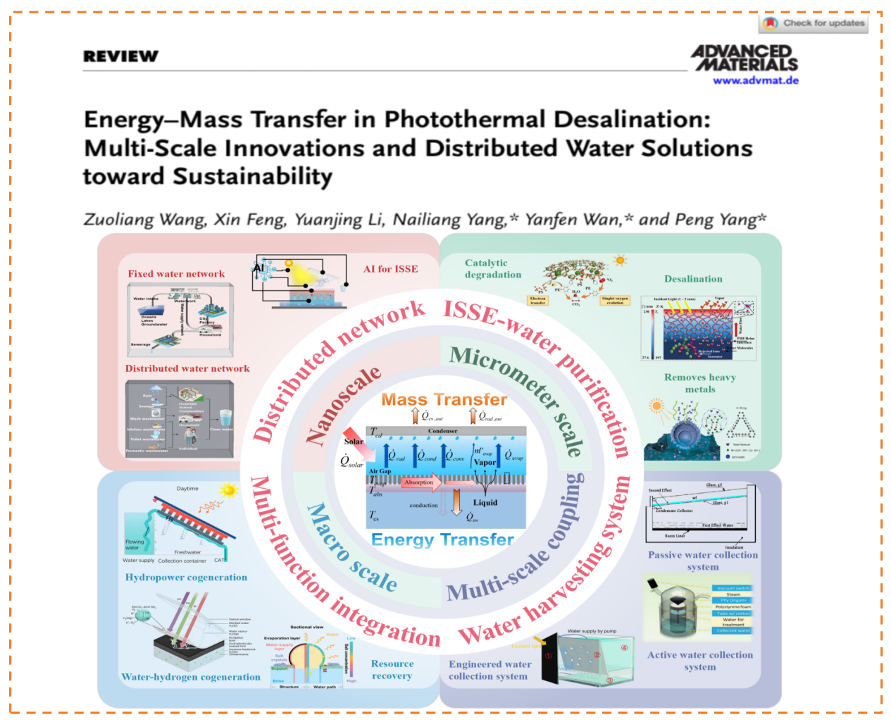 近日,云南大学材料与能源学院和国际河流与生态安全研究院王作亮博士、万艳芬教授团队在材料科学领域知名期刊Advanced Materials(影响因子26.8)上发表综述论文“Energy–Mass Transfer in Photothermal Desalination:Multi‐Scale Innovations and Distributed Water Solutions toward Sustainability”(论文链接:https://doi.org/10.1002/adma.202510796)