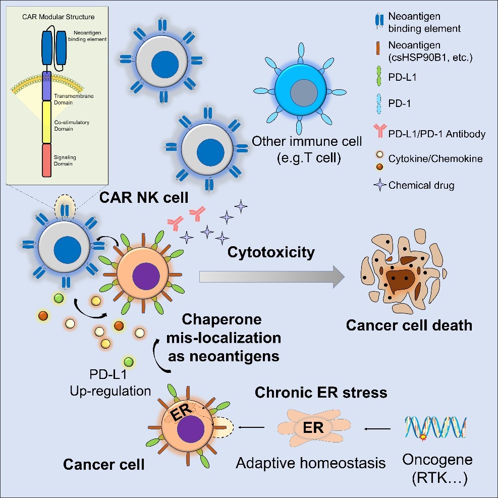 近日,云南大学生物医药研究院陈大华教授团队通过多组学分析发现,AML细胞在特定癌基因突变压力下会将其内部的分子伴侣蛋白暴露于表面,这成为了它们的致命弱点,有望成为白血病癌细胞的“阿喀琉斯之踵”。基于这一发现,研究人员成功开发了靶向这类新抗原靶点的CAR-NK(嵌合抗原受体自然杀伤)细胞疗法,该疗法在实验室和动物模型的临床前研究中显示出显著地抗癌疗效,同时,并未对健康细胞产生明显的毒副作用。该研究成果以“Chronic ER Stress Triggers Cell-Surface Chaperones as the Therapeutic Targets of CAR Cells in Acute Myeloid Leukemia”为题,发表于国际期刊Advanced Science,为急性髓系白血病的治疗提供了新的策略。