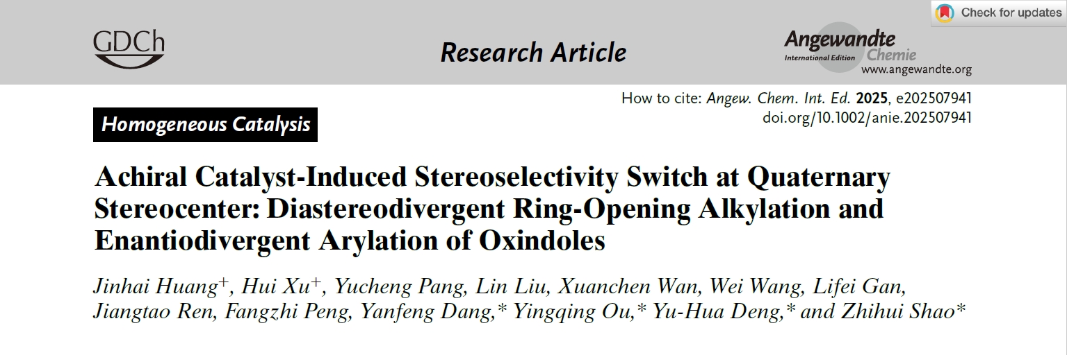 近日,云南大学化学科学与工程学院邵志会教授团队,在手性分子的立体发散性合成研究中取得重要进展。相关研究成果以“Achiral Catalyst-Induced Stereoselectivity Switch at Quaternary Stereocenter: Diastereodivergent Ring-Opening Alkylation and Enantiodivergent Arylation of Oxindoles”为题,在化学学科国际顶级期刊Angewandte Chemie International Edition上发表(doi.org/10.1002/anie.202507941)。