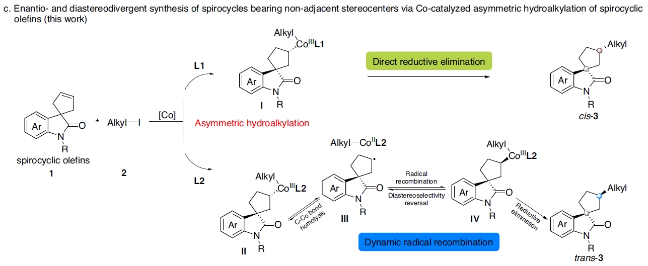 手性螺环骨架因其刚性结构和潜在的生物活性,在药物发现和手性配体开发中备受关注。然而含有非相邻手性中心螺环分子的立体发散性合成,一直存在较大挑战。该研究发展了一种动态自由基重组新策略,实现了钴氢催化、配体调控的螺环烯烃立体发散性氢烷基化反应。在该研究中,通过选用不同的手性双恶唑啉配体(L1与L2),以高对映选择性和非对映选择性(高达>99:1er和>20:1dr)分别获得顺式(cis)和反式(trans)两种不同立体构型的螺环产物,实现了非相邻手性中心的立体发散性构建。该反应体系兼容了多种螺环烯烃底物,包括吲哚酮、苯并呋喃酮、异色酮、吡咯烷酮和哌啶酮等底物的衍生物。