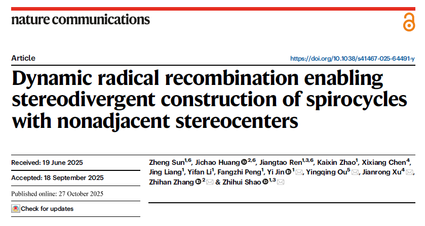 近日,云南大学化学科学与工程学院邵志会教授团队在手性分子立体发散性合成研究取得新进展,相关研究成果以“Dynamic radical recombination enabling stereodivergent construction of spirocycles with nonadjacent stereocenters”为题,在《Nature Communications》上发表。